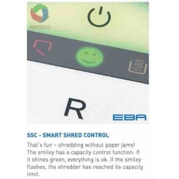 With SSC –smart shred control: a smiley on the EASY-SWITCH element indicates the used sheet capacity during shredding process to avoid paper jams. High-quality, paper clip proof cutting shafts from special hardened steel with guarantee* High-quality wooden cabinet. Convenient environmentally-friendly shred bin (no disposable shred bags required). Used EBA PAPER SHREDDER 1824 C for your comfort and safety.