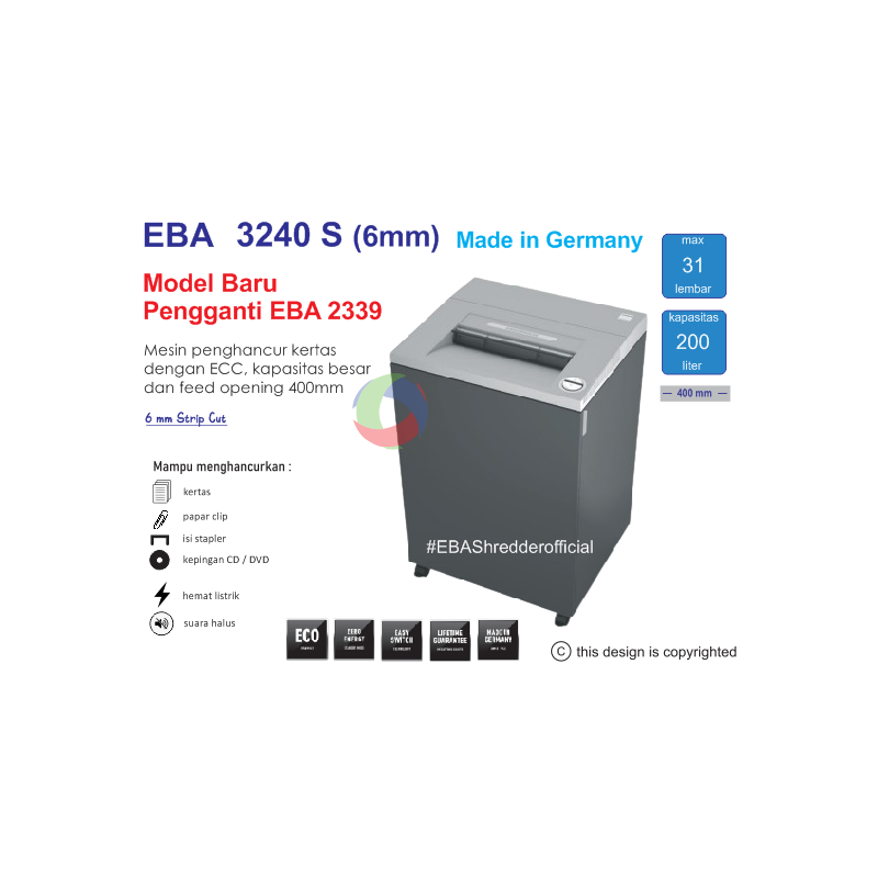Patented ECC - Electronic Capacity Control – indication of the used sheet capacity during shredding process. High-quality wooden cabinet, mobile on castors. Convenient environmentally-friendly\ shred bin (no disposable shred bags required).EBA PAPER SHREDDER 3240 S is suitable for those of you who need speed, accuracy, comfort and security.